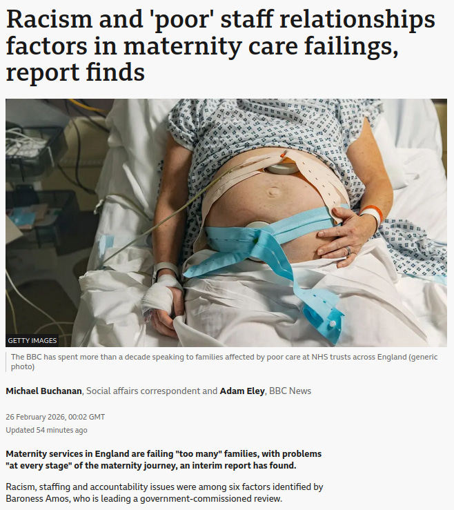 The same loop appears in the BBC’s February 26, 2026 maternity report coverage. The official Baroness Amos interim report ranks racism third among six systemic factors — yet the headline led with “Racism and ‘poor’ staff relationships factors in maternity care failings”. Capacity pressures (overstretched wards, staff shortages) were #1, but the BBC prioritised the WEF/UN-aligned “racism” hook. NHS England itself is a WEF partner organisation, and the BBC (another WEF affiliate) framed the crisis through the same racial equity lens the WEF Strategic Intelligence promotes as a top global risk. When the broadcaster and the health service both swim in the same Davos pool, national clinical reality is subordinated to globalist narrative priorities.