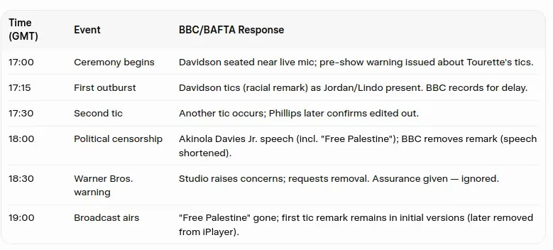 The BAFTAs under BBC coverage showed political statements like “Free Palestine” from Akinola Davies Jr.’s speech were removed (speech shortened to ~1 minute, citing time restrictions), while an involuntary medical tic was broadcast — generating viral domestic “racism” outrage.
