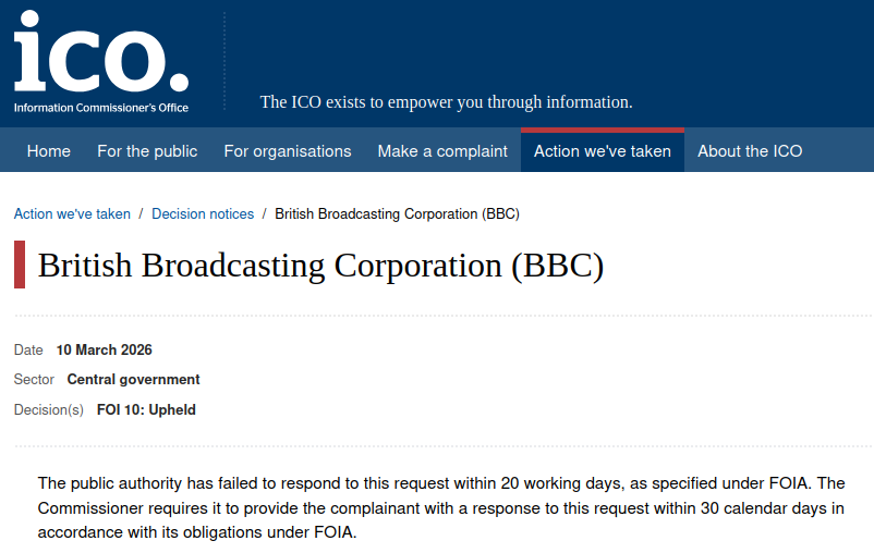 Ruling: IC-469300-M4Z6 isn’t just a slap on the wrist for being late. This is a formal legal order for the BBC to stop evading. When faced with a perfectly reasonable Freedom of Information (FOI) request regarding its senior leadership’s communications with a foreign power, the BBC didn’t just miss a deadline - it attempted to gaslight the regulator.