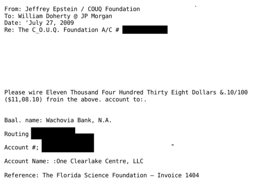 The Recipient & Amount: Epstein requested a wire of $11,438.10 from his C.O.U.Q. Foundation account. [p. 1]