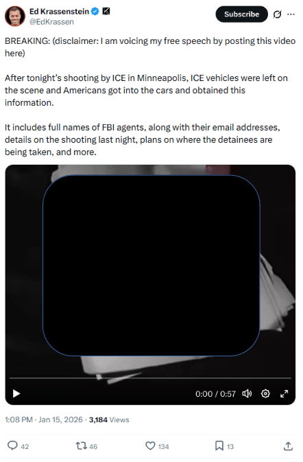 Ed Krassenstein maintains a significant audience on X by positioning himself as an arbiter of government accountability, particularly regarding immigration enforcement. His January 15, 2026, post exemplifies this posture: he shared a 'BREAKING' video containing unredacted information reportedly accessed from ICE vehicles during the Minneapolis unrest. The files—which include the names and contact details of FBI agents, sensitive data on the January 7 shooting of Renee Nicole Good, and detainee movement logs—were presented with a 'free speech' disclaimer. However, by his own description, this material was not provided by a principled whistleblower, but was instead obtained through the opportunistic theft of government property from vehicles left unattended during civil unrest. This distinction transforms the post from an act of transparency into the high-profile laundering of stolen federal assets.