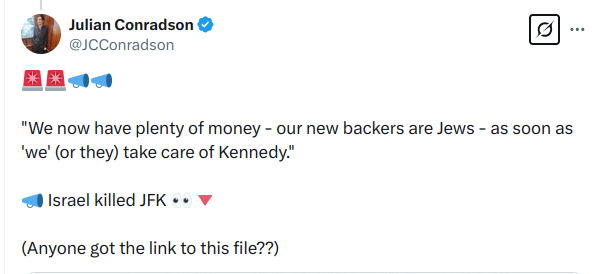 @JCConradson post cites a disputed JFK quote: “We now have plenty of money—our new backers are Jews—as soon as ‘we’ (or they) take care of Kennedy,” hinting at Israel’s role and blackmail networks. The BBC omits this key factor from its reporting, clinging to its own narrative.