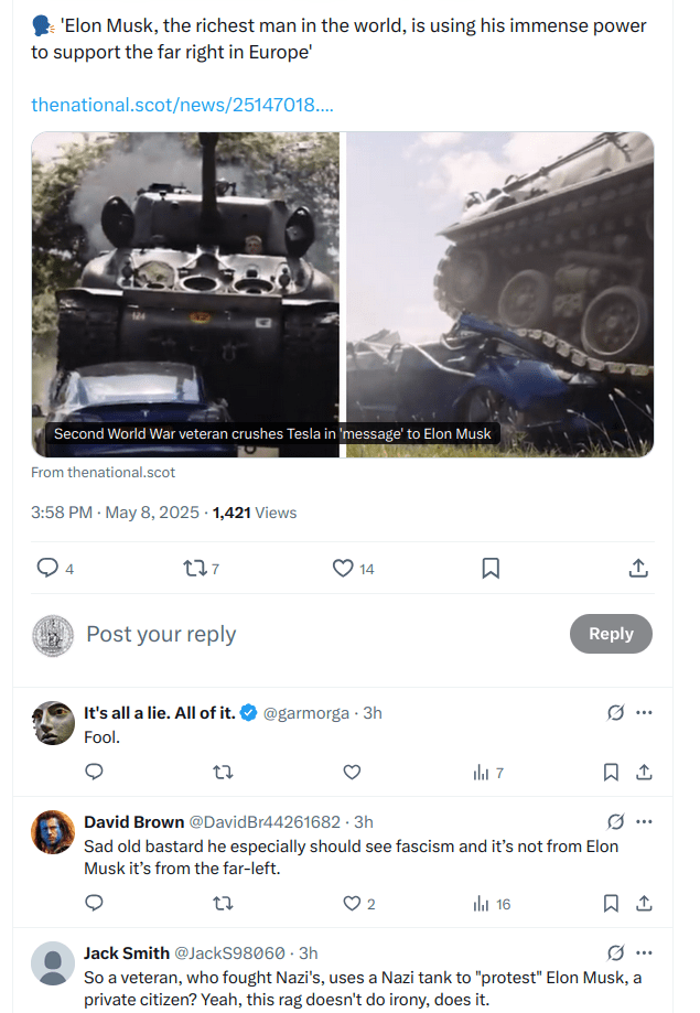 https://www.thenational.scot/news/25147018.wwii-veteran-crushes-tesla-tank-elon-musk-protest/