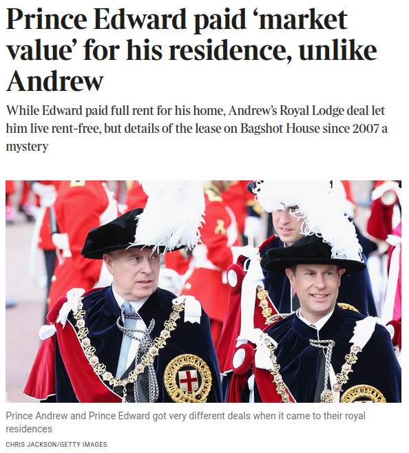 Edward was reported to have extended the lease to 150 years for £5 million in 2007. Despite releasing an unredacted copy of Andrew’s lease, the Crown Estate refused to disclose Edward’s at the 51-acre Bagshot Park, his residence for more than 25 years..."