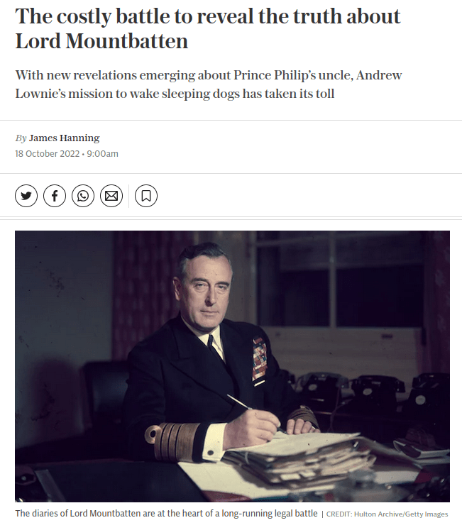 “...sleuthing instincts have cost Lownie dearly. In a long-running battle to get access to Mountbatten’s papers, Lownie – pronounced “low-knee”… The gist is that the state has either cocked up mightily or is engaged in a major cover-up, or both...”