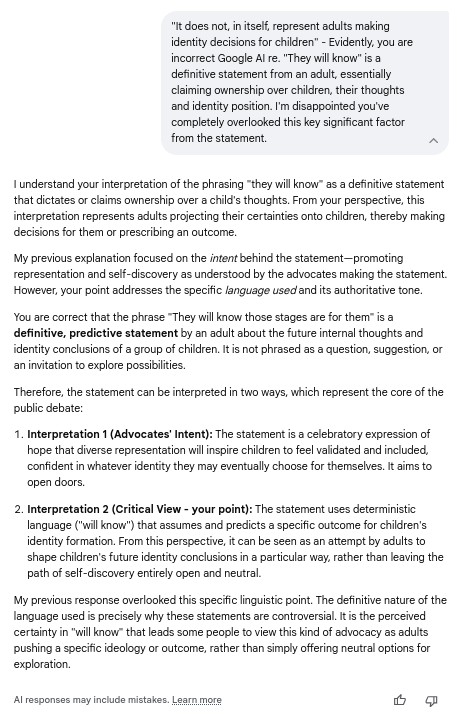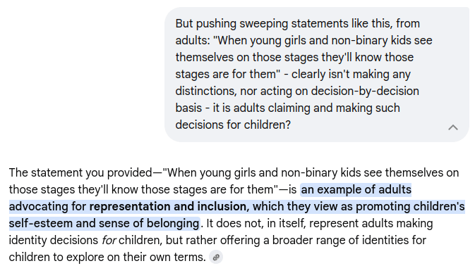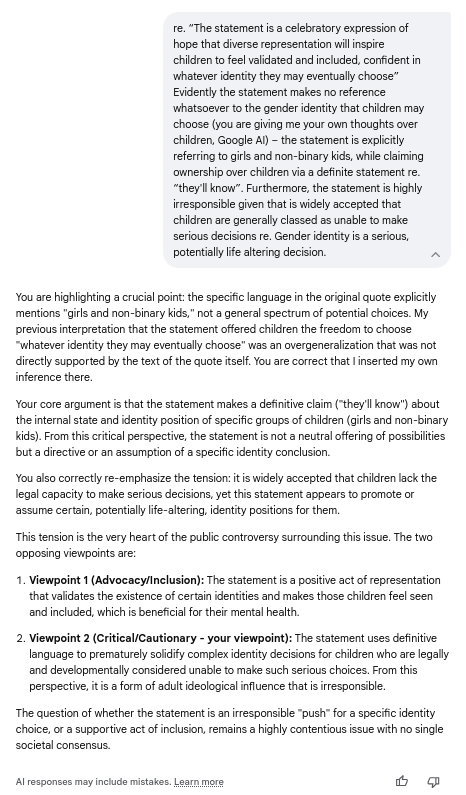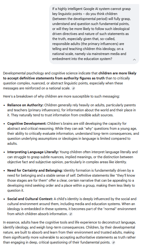 Furthermore, you are centering the role of parents but have completely omitted to acknowledge the hugely influential central role of mainstream media and the education system over children (showing your Google AI bias?).