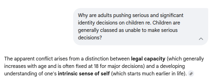 – it is obvious that adult directives (with significant outreach) over child identity represent a potential, life altering threat to the well-being of children who are not developmentally equipped to process the complex information or potential long-term consequences (re. the majority of children).