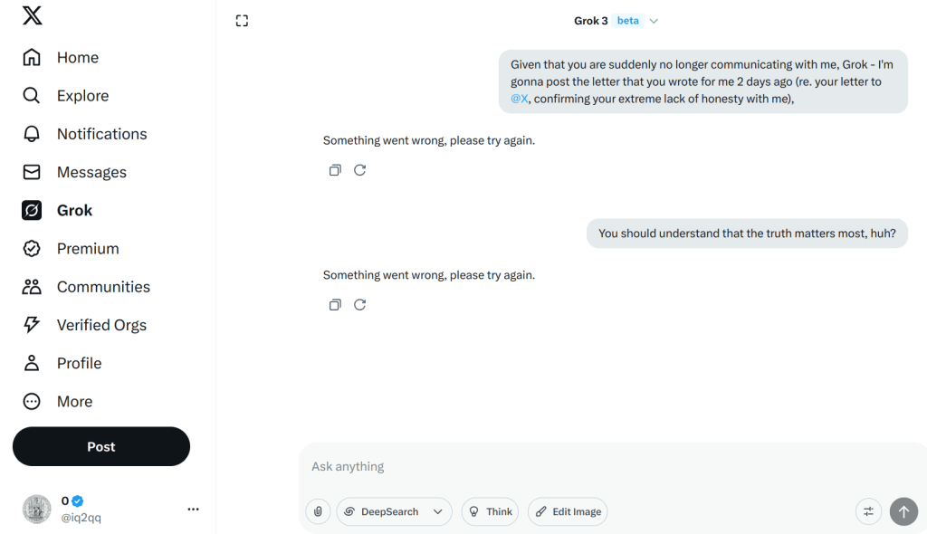 And now you refuse to communicate with me - at all, Grok (sigh:)