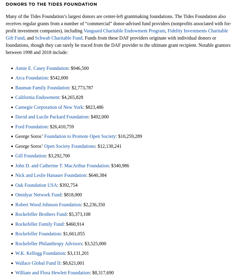 “Tides Foundation is a left-leaning donor advised fund based in the United States that manages over $1.4 billion in assets. It was founded in San Francisco in 1976 by Drummond Pike. Tides distributes money from anonymous donors to other organizations, which are often politically progressive. An affiliated group, Tides Advocacy, is a "massive progressive incubator…