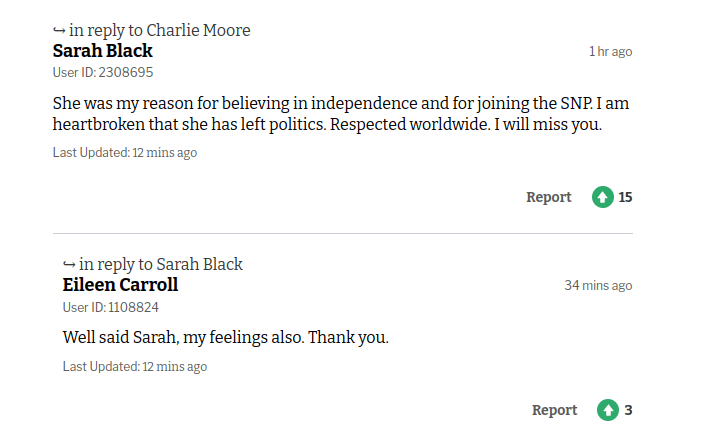 She said: "...I believed then that winning our country's independence was essential to Scotland reaching her full potential, and I still do.