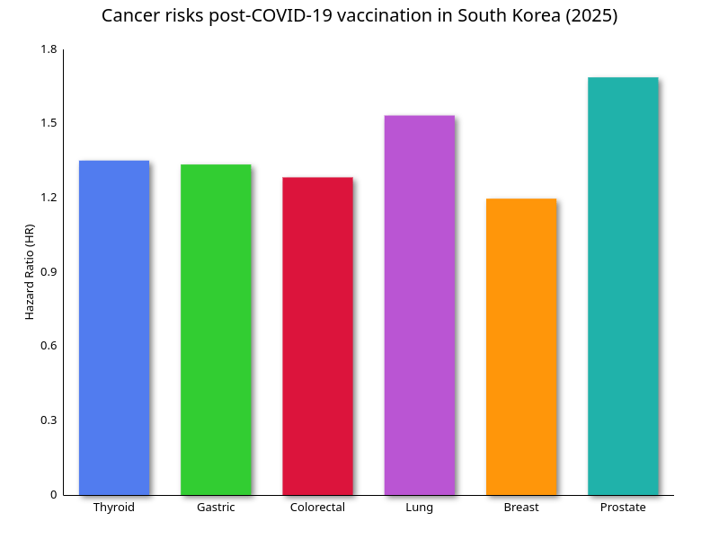 Bar graph showing hazard ratios (HR) for cancer risks post-COVID-19 vaccination in South Korea (2025). Thyroid (1.351), Gastric (1.335), Colorectal (1.283), Lung (1.533), Breast (1.197), Prostate (1.687):