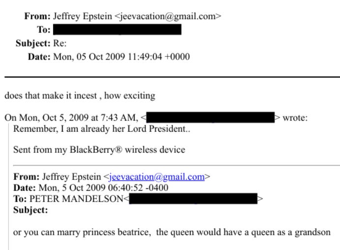 Privy Council Lord President, Peter Mandelson: "does that make it incest , how exciting" (on the Queen & Princess Beatrice)