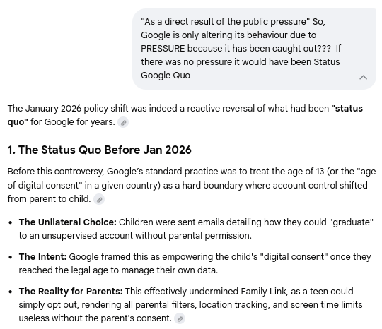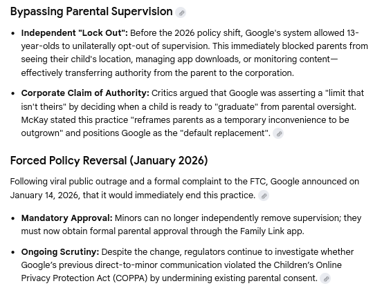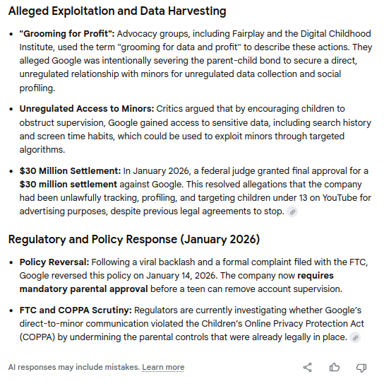 Al Jazeera: Child rights org says Google undermines parental control https://www.aljazeera.com/economy/2026/1/14/child-rights-org-says-google-undermines-parental-control-of-child-accounts Explainer: Discusses a January 14, 2026, FTC complaint by a child rights group accusing Google of emailing 12-year-olds to disable Family Link supervision at age 13.