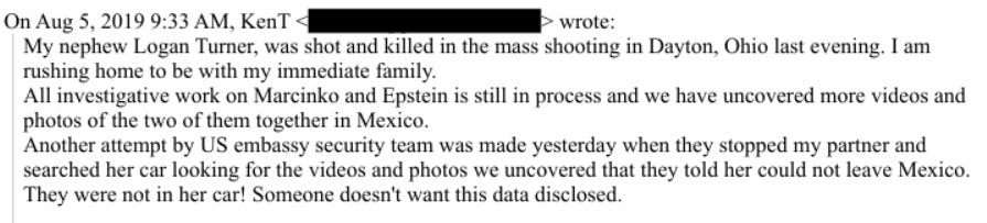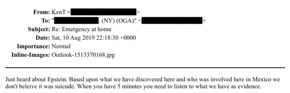The Murder/Suicide Dispute: Hours after Epstein’s death, investigator Ken Turner informed the NYPD Task Force that based on Mexican investigative evidence, he did not believe the official Epstein suicide narrative. [p. 1]