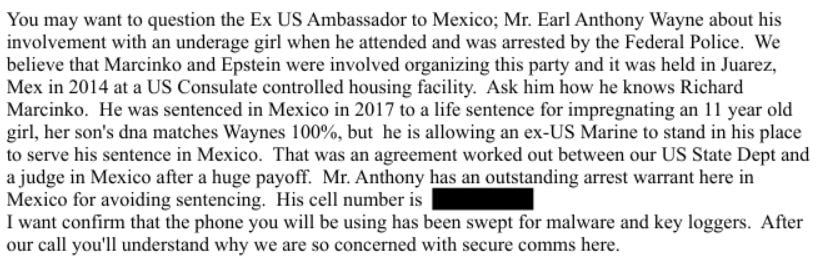 The Ambassador Scandal: Turner alleges US Ambassador Earl Anthony Wayne was arrested by Mexican Federal Police for involvement with an underage girl at a Juarez party in 2014, organized by Epstein and Marcinko. [p. 4]