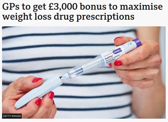 When a GP clicks ‘Yes’ on OB005 — the clinical euphemism for prescribing the jab — it’s not a consultation; it’s a transaction. Your BMI and compliance become a bounty-hunting ledger entry. The government demonises “rogue private prescribers” while turning every GP practice into the biggest quota-driven distributor of all.