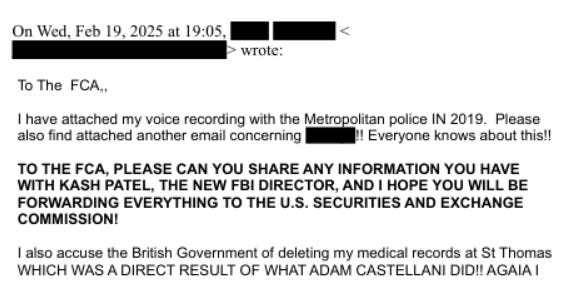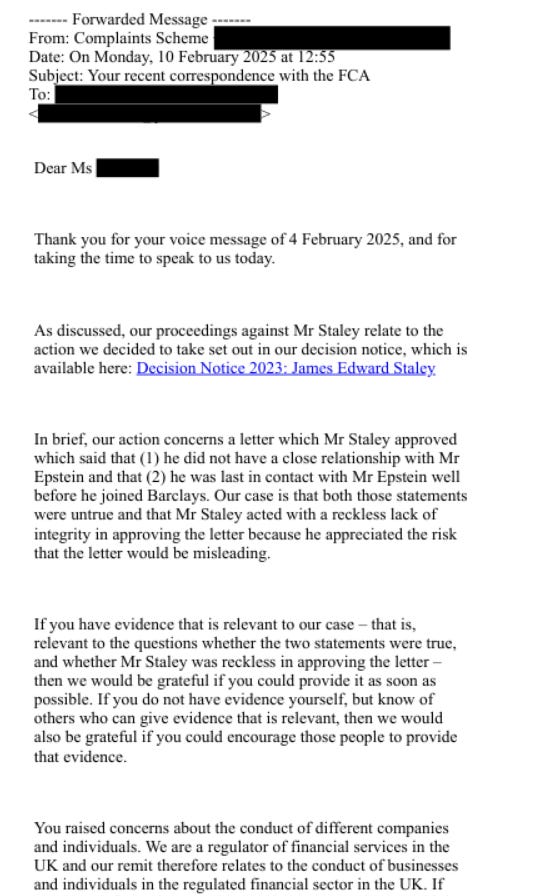 Feb 4–10, 2025: Victim contacts FCA multiple times (voice messages/emails) on Epstein ties, Mandelson, Jes Staley, financial red flags. FCA response: Acknowledges but deflects—”outside our remit” for non-financial matters; refer elsewhere. Critics: This was a failure to escalate trafficking/leak allegations to Met/Home Office.