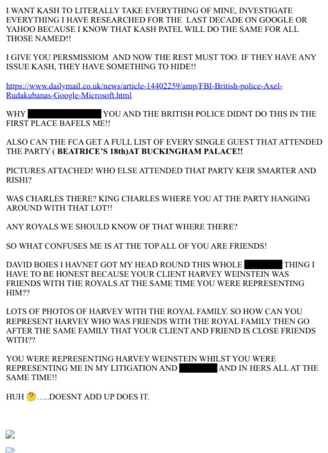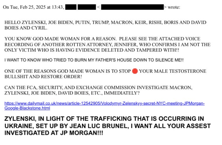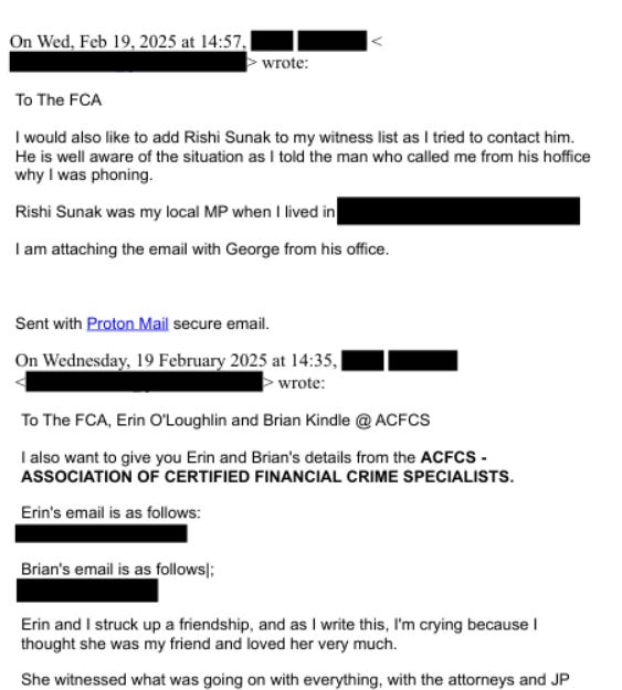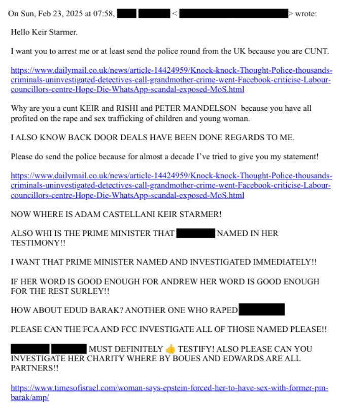 Feb 19–23, 2025: Emails name Starmer/Sunak directly. Warns Starmer: “IF YOU OR THE GOVERNMENT IN ANY WAY HELP OBSTRUCT JUSTICE THAT WILL BE ADDED IN MY CASE AGAINST YOU.” Adds Sunak to witness list (via “George” from his office; Sunak was her local MP as PM). References 2019 Met recording naming a British Prime Minister and Mandelson links.