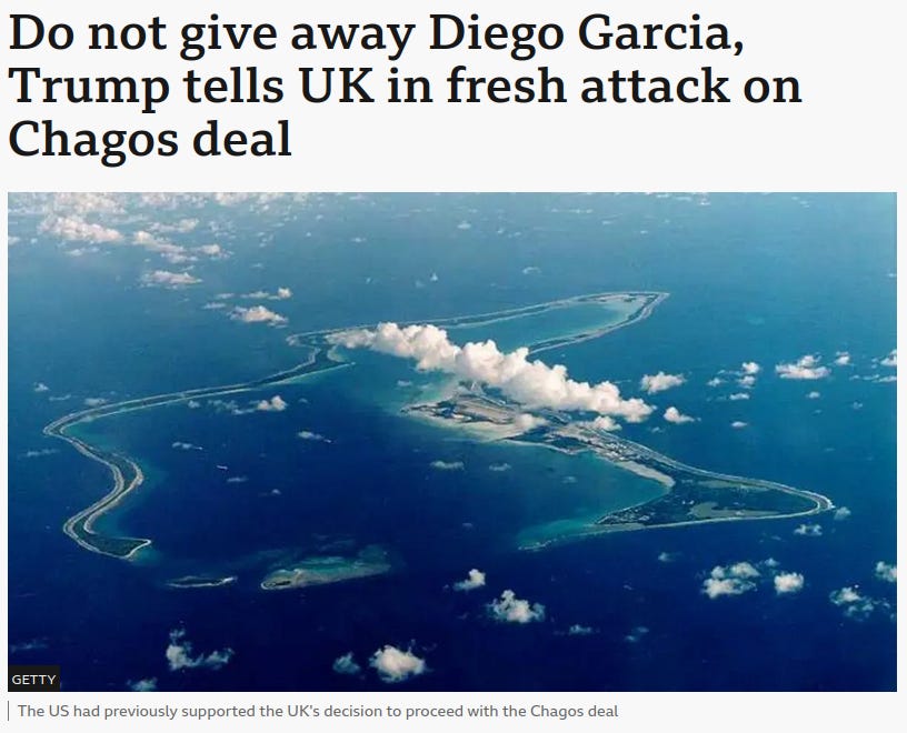President Trump brands the deal an “act of great stupidity” and a “national security disaster.” He tells Starmer: “DO NOT GIVE AWAY DIEGO GARCIA!”