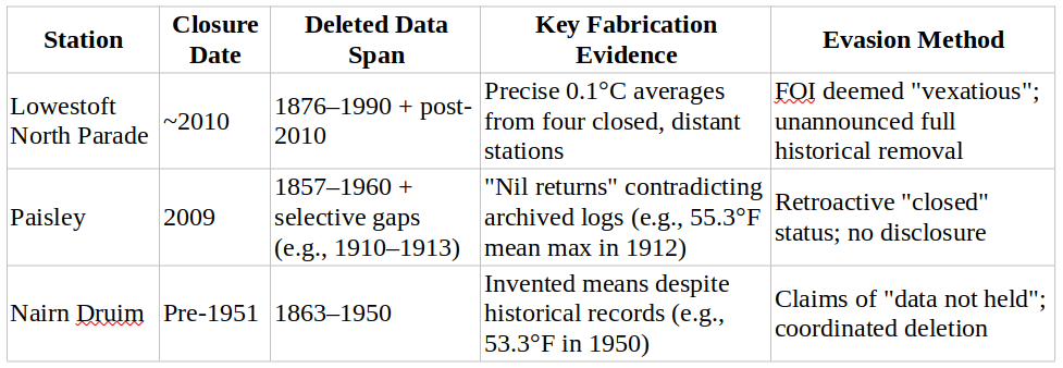 Rather than address the discrepancies, the Met Office dismissed Sanders' Freedom of Information (FOI) requests as "vexatious," a bureaucratic shield against public inquiry from an entity sustained by public funds. The response? In a covert operation, they excised all post-2010 data—and much more—from public datasets, including 114 years of records dating to 1876. Files such as lowestoftdata.txt now display asterisks for missing values, with no announcement or corrective statement. This purge extended to Paisley (closed 2009, records from 1857 onward removed) and Nairn Druim (pre-1951 closure, 1863–1950 data vanished). Analysts suggest up to 100 similar UK stations have relied on invented estimates, inflating national trends to portray unprecedented warming. Such actions betray a deeper intent: preserving a fragile storyline at the expense of transparency. As detailed in recent analyses, the deletions amount to an implicit admission of indefensibility.