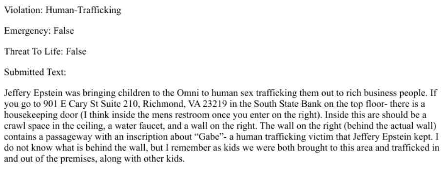 The Victim Testimony: The anonymous complainant states, “as kids we were both brought to this area and trafficked in and out of the premises.” [p. 1]