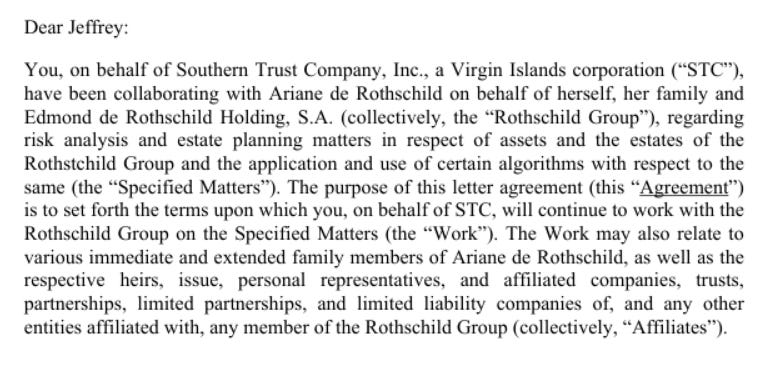 The High-Level Fixer Contract: A formal September 2015 letter of agreement between Epstein’s Southern Trust Company (STC) and Ariane de Rothschild on behalf of the Edmond de Rothschild Holding (EDRH). [p. 1]
