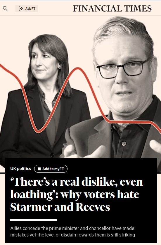 "sir Keir Starmer ends 2025 as the most unpopular British prime minister in polling history, while Rachel Reeves, his chancellor, plumbs similar depths of public dislike. But one thing still surprises the pollsters: the level of apparent hatred felt towards them.