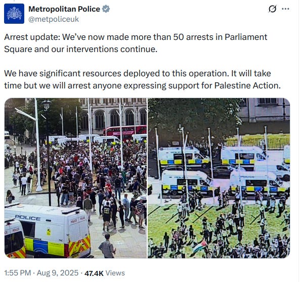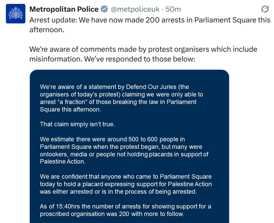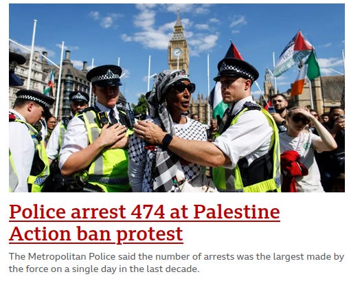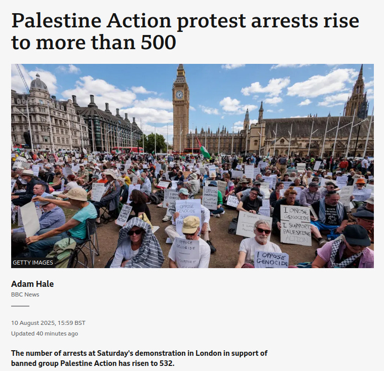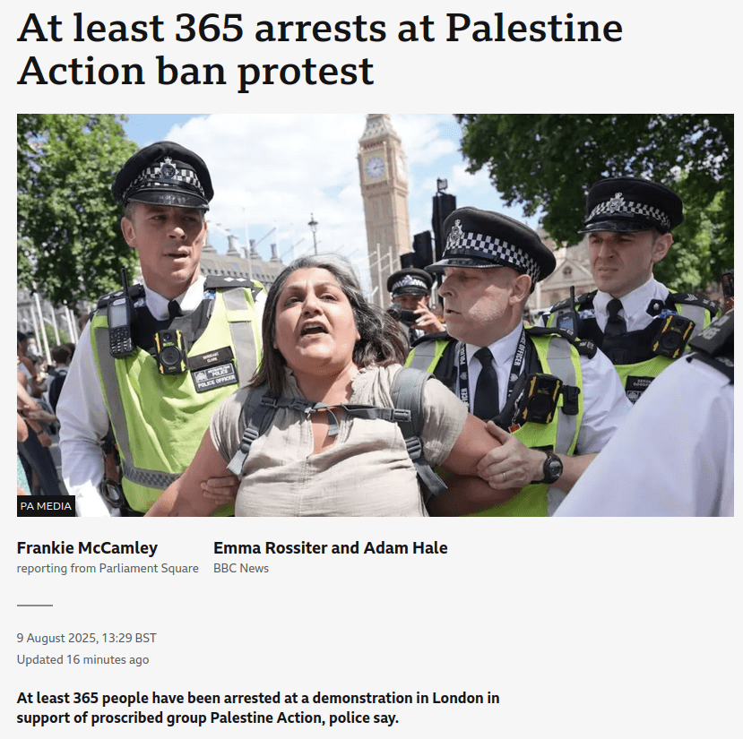 BBC: More than 150 arrests at Palestine Action ban protest: