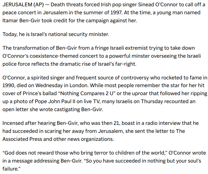 AP News (2023): His campaign forced Sinead O’Connor to scrap a 1997 Jerusalem concert. Now he is a Cabinet minister