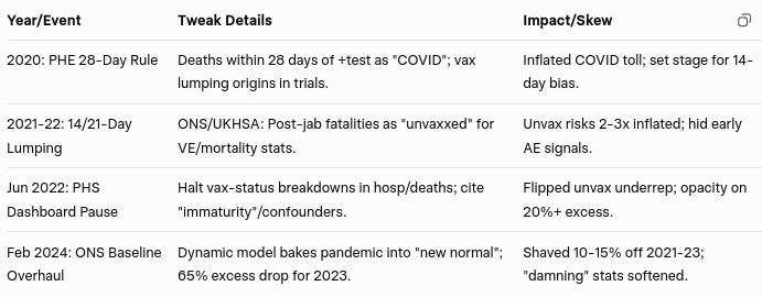These aren't tweaks—they're erasers, systemic dodges that cascade globally (CDC mirrored the lumping). Early: Pump vax efficacy by dumping harms. Later: Downplay excess by redefining "normal." BMJ and parliamentary grillings called it out, but no full rewind—leaving 200K+ unexplained deaths since 2020 as footnotes.
