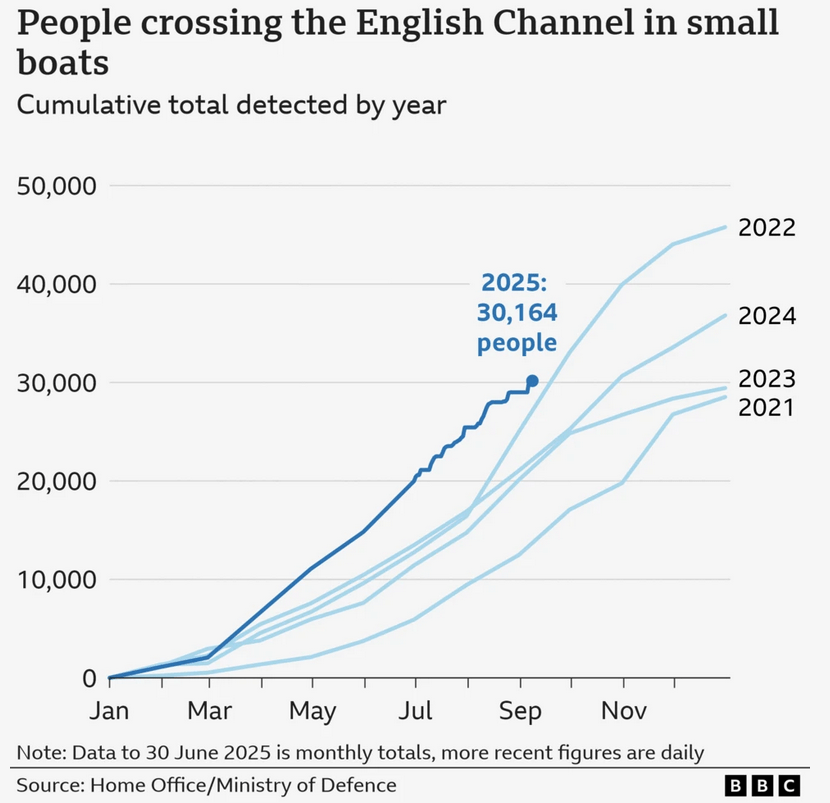 "As of 8 September, 30,164 people had crossed the Channel in small boats in 2025, up from 22,440 for the same period in 2024.